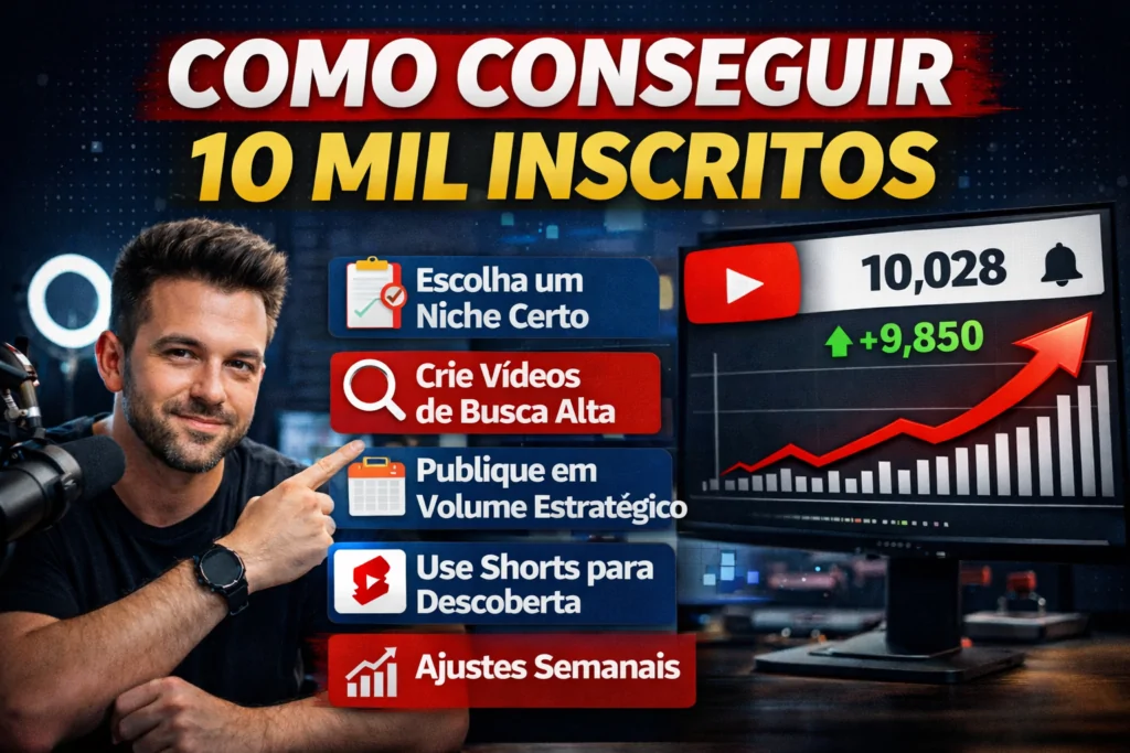 Alcançar 10 mil inscritos no YouTube em menos de 90 dias é totalmente possível, mas só para quem trata o canal como projeto estratégico, não como experimento.Não é sobre postar mais. É sobre postar certo, com foco absoluto em demanda, retenção e distribuição. Abaixo está o passo a passo completo, do zero aos 10 mil inscritos, sem atalhos ilusórios. Passo 1: Defina um Posicionamento que o Algoritmo Entenda Antes de gravar qualquer vídeo, você precisa responder a uma pergunta simples: Por que alguém se inscreveria no seu canal em menos de 30 segundos? Canais que crescem rápido têm: Exemplos de posicionamento claro: Se o YouTube não entende seu canal em 5 vídeos, ele não recomenda. Passo 2: Crie Conteúdo Baseado em Perguntas Reais (Demanda Ativa) O erro mais comum é criar vídeos sobre o que você quer falar, não sobre o que as pessoas procuram. A regra é simples: Exemplos práticos: Vídeos genéricos crescem devagar. Vídeos específicos crescem rápido. Passo 3: Planejamento de Conteúdo para 90 Dias Para bater 10 mil inscritos em até 3 meses, você precisa de volume estratégico, não exagero. Plano mínimo recomendado: Em 90 dias, isso gera: Esse volume permite que o algoritmo teste, aprenda e escale. Passo 4: Estrutura de Vídeo que Retém Atenção O crescimento não vem de visualização. Vem de retenção. Estrutura simples e eficiente: Exemplo de gancho: “Se você continuar postando desse jeito, seu canal não vai passar de mil inscritos.” Sem introdução longa. Sem história pessoal no início. Passo 5: Shorts como Máquina de Descoberta Shorts são o maior acelerador de inscritos hoje. Eles não servem para ensinar tudo. Servem para: Estrutura de Short que funciona: Exemplo: “O erro que faz 90% dos canais morrerem antes dos 1.000 inscritos…” Passo 6: Chamada para Inscrição que Converte Pedir “se inscreva” não funciona. O que funciona é contexto + benefício. Exemplo: “Se você quer crescer no YouTube sem depender de sorte, se inscreve aqui porque os próximos vídeos são exatamente sobre isso.” Essa abordagem aumenta muito a conversão por vídeo. Passo 7: Ajustes Semanais Baseados em Dados Toda semana, analise: Faça mais do que funciona. Corte o resto. YouTube recompensa clareza e repetição estratégica. Perguntas Frequentes É possível chegar a 10 mil inscritos sem aparecer? Sim. Desde que o conteúdo seja claro, direto e resolva problemas reais. Voz, tela ou texto funcionam. Shorts substituem vídeos longos? Não. Shorts trazem inscritos rápidos. Vídeos longos constroem autoridade e confiança. Quantos vídeos são necessários para chegar a 10 mil inscritos? Entre 30 e 40 vídeos bem posicionados, com Shorts apoiando, costumam ser suficientes. Preciso investir em anúncios? Não. Estratégia orgânica bem executada é suficiente para atingir 10 mil inscritos. Canal novo cresce mais rápido? Sim. Canais novos, quando acertam posicionamento e retenção, crescem mais rápido que canais antigos. Conclusão 10 mil inscritos em menos de 3 meses não é mágica.É processo, disciplina e estratégia clara. Quem trata o YouTube como negócio cresce.Quem trata como hobby, não.